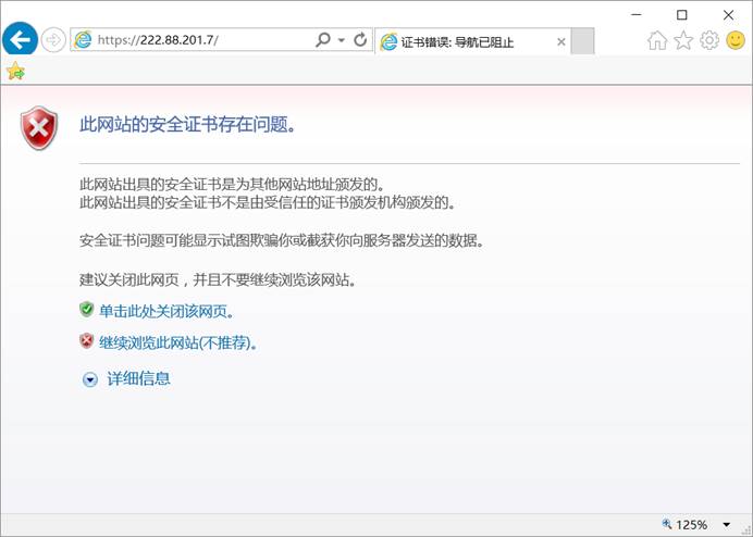 8、确定之后关闭浏览器,重新打开浏览器,在地址栏输入:https://222.88.201.7,回车。会提示此网站的安全证书有问题,点击“继续浏览此网站”。