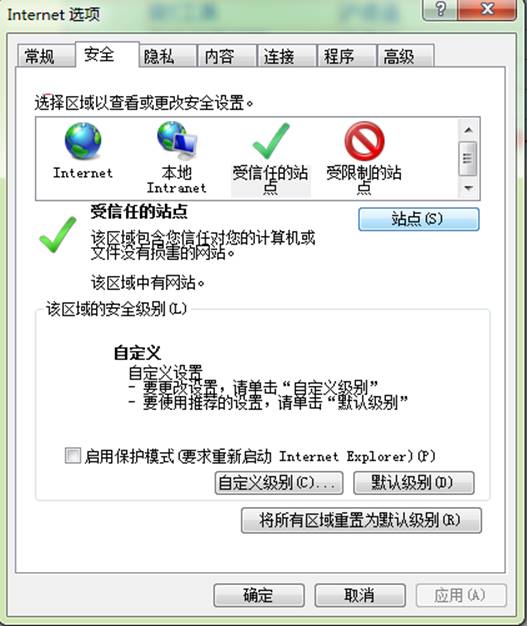 3、点击最上方的安全选项,选中 “受信任的站点”,然后点击“站点”。