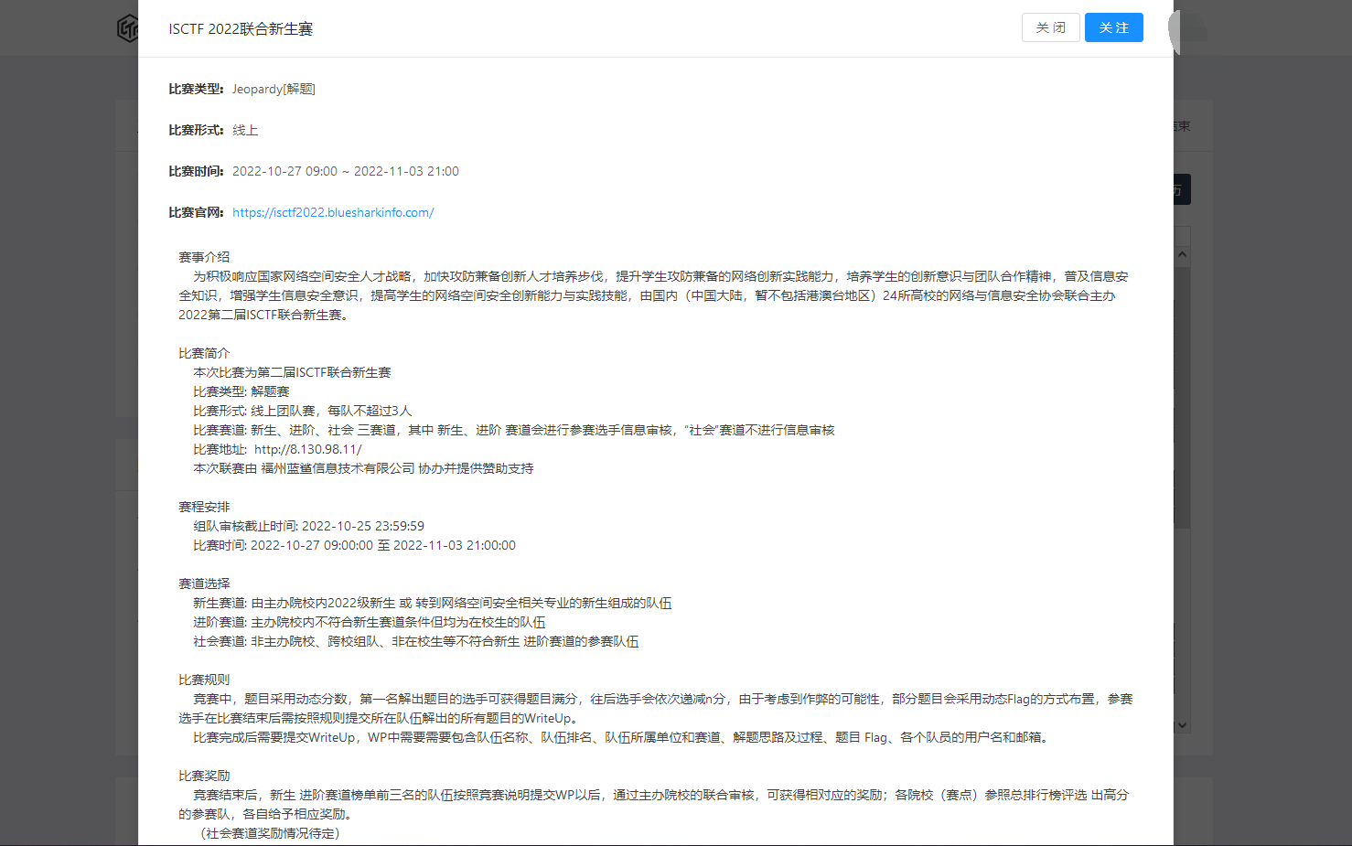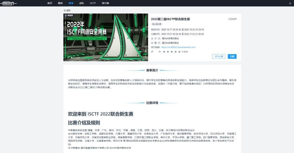 大赛自开启报名通道以来,共有1683名选手参赛,共818支队伍同场竞技。10月27日上午9点,ISCTF联合新生赛 正式开始。大赛采用主流的线上CTF夺旗赛的解题模式,各校的学生均可报名为参赛者以不超过三人一队为单位。竞赛题目类型包括:Web安全、Reverse(逆向)、Crypto(密码学)、Misc(杂项)、PWN等,综合考察参赛者不同维度的网络安全知识理论与技术水平。本次比赛新增加AWD攻防体验赛,我校选派出一队参加,和各主办院校优秀队伍同台竞技学习。